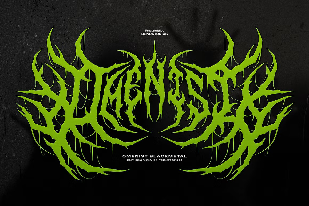 Omenist is a bold and brutal Black Metal typeface, perfect for adding a dark, aggressive edge to your creative projects. Ideal for logos, branding, homeware, product packaging, mugs, quotes, posters, shopping bags, t-shirts, book covers, business cards, invitations, greeting cards, labels, photography watermarks, special events — and any other project that craves a Black Metal vibe.